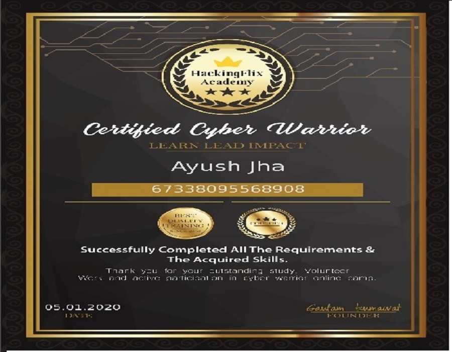 The holder of this badge has validated his skills in White Collar Crime Investigation, Web Application Security Vulnerability Scanning, Security Testing, Penetration Testing, Mobile Security, Metasploit, Malware Analysis, Kali Linux, Information Security Audit, Information Gathering, Google Hacking ,Ethical Hacking, Digital Forensics, Cyber Security, Computer Hacking Forensic Investigator Computer Forensics and Certified Ethical Hacker